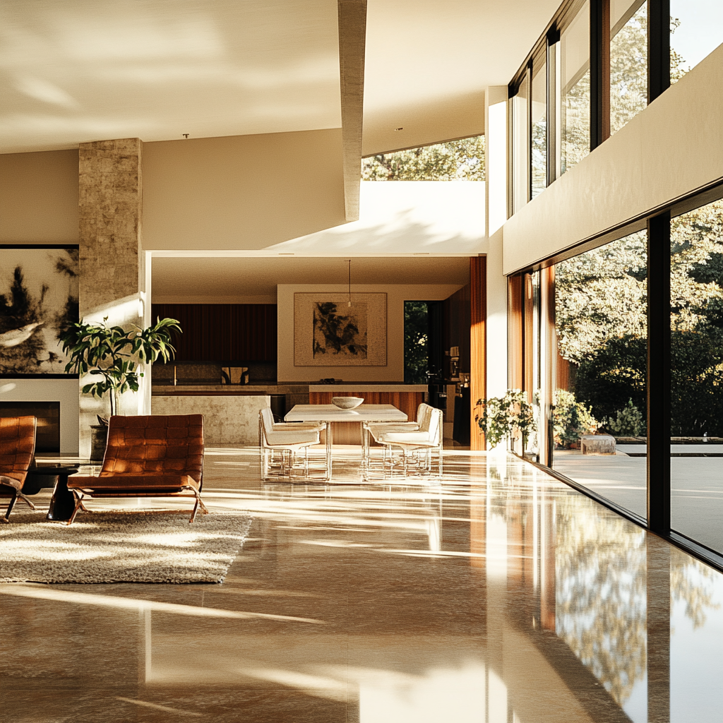 Bright and spacious living room with large floor-to-ceiling windows, modern furniture, a stone fireplace, and indoor plants.